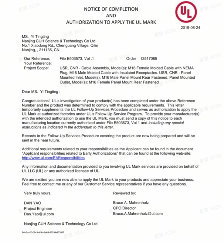 Our power plugs have all passed the US UL certification. If customers want to export their products to the US, Canada, and other North American markets, the UL-certified CUH authentic power cord is a must.