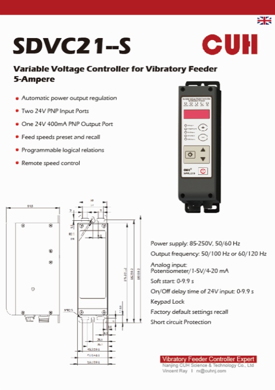 4. Compact Voltage Regulator (SDVC21-S) As a 5A standard voltage regulation product, it has automatic voltage regulation, programmable logic relationship and remote speed control functions, built-in short circuit protection, and provides a cost-effective and reliable choice for basic vibration feeding.