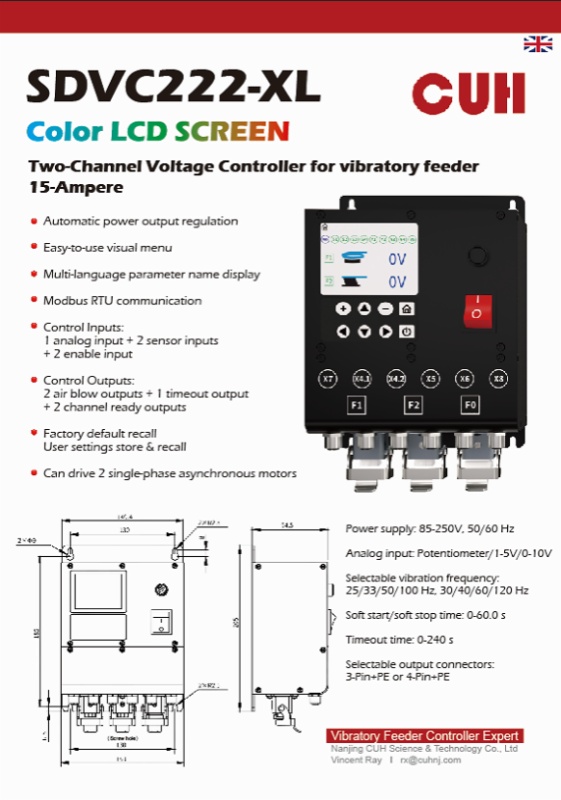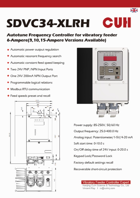 1.Intelligent adaptive frequency modulation controller series (SDVC34-XLRH/SDVC31-MH/SDVC31-XLH) This series is specially designed for high-precision vibration feeding. The core advantages include: It has the functions of automatic output voltage regulation, automatic resonant frequency search and automatic maintenance of constant feeding speed. Standard Modbus RTU communication protocol and programmable logic relationship, easily integrated into large-scale automated production lines. The output frequency range is wide (25.0-400.0 Hz or 40.0-400.0 Hz), and multiple current versions from 3A to 15A are available to match different loads.