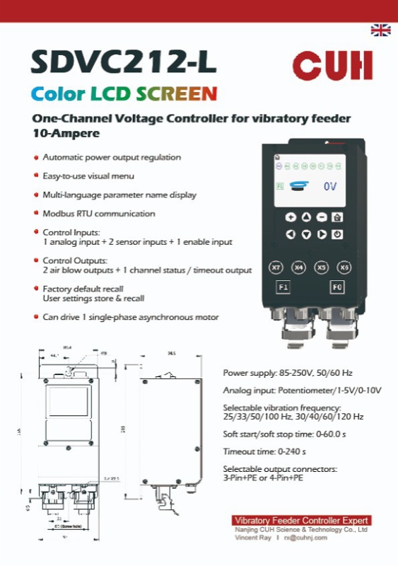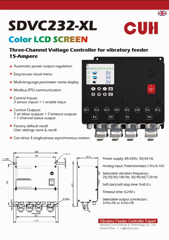 1.Intelligent adaptive frequency modulation controller series (SDVC34-XLRH/SDVC31-MH/SDVC31-XLH) This series is specially designed for high-precision vibration feeding. The core advantages include: It has the functions of automatic output voltage regulation, automatic resonant frequency search and automatic maintenance of constant feeding speed. Standard Modbus RTU communication protocol and programmable logic relationship, easily integrated into large-scale automated production lines. The output frequency range is wide (25.0-400.0 Hz or 40.0-400.0 Hz), and multiple current versions from 3A to 15A are available to match different loads.