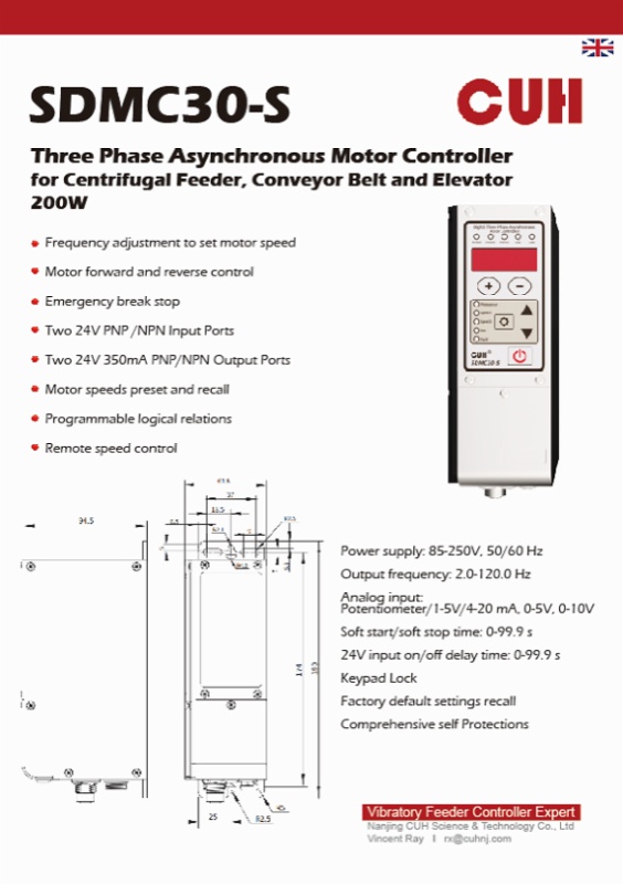 3.Three-phase asynchronous motor controller (SDMC30-S) is specially designed for centrifugal feeder, conveyor belt and 200W hoist: It supports 2.0-120.0 Hz frequency adjustment to accurately control the motor speed, and has motor forward and reverse control and emergency braking functions. Compatible with potentiometers and a variety of analog inputs (1-5V, 4-20 mA, 0-5V, 0-10V), providing a comprehensive self-protection mechanism.